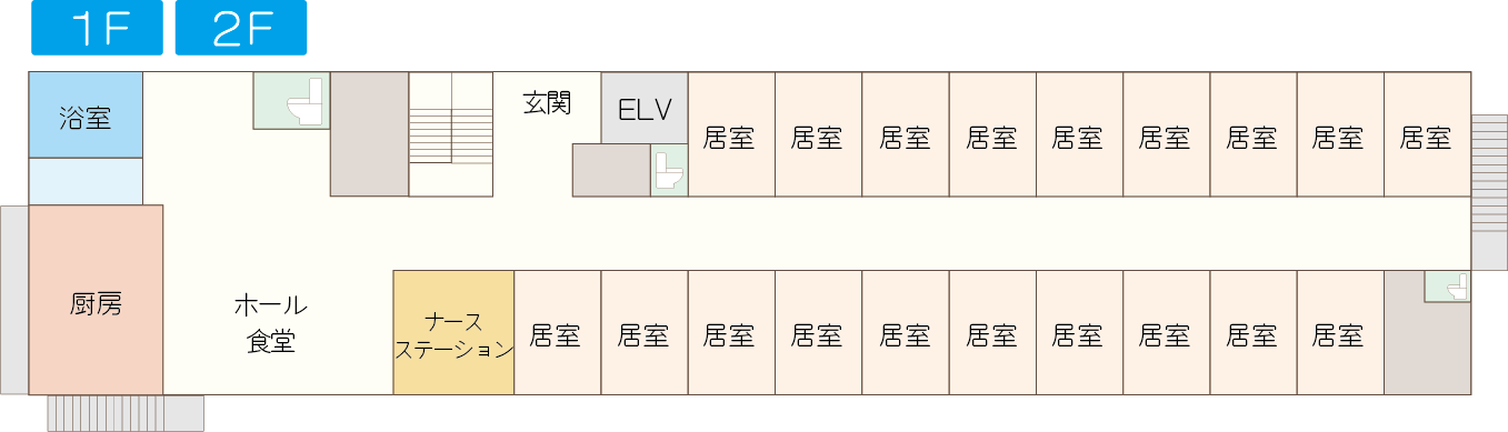 専門スタッフが 24時間体制で見守り、 安心の毎日を支えます。 全室個室の居室と バリアフリー設計で 安全で快適な生活を サポートします。